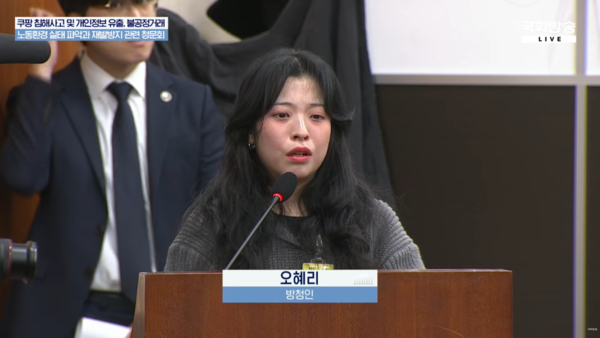 이날 청문회에는 지난 11월 새벽배송 현장에서 사고로 숨진 고 오승룡 씨의 누나 오혜리 씨도 방청인으로 참석했다.