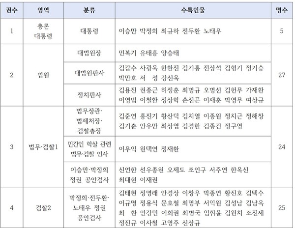 1차 출간분인 1~4권에는 전직 대통령, 정치판사, 정치검사 등 81명이 수록된다. 이 중 36명이 2026년 3월 현재 생존해 있다.