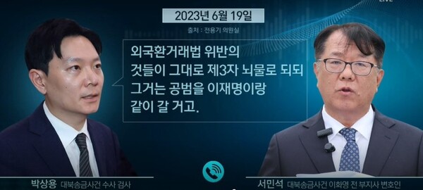 이렇게 되면 이 전 부지사를 대북송금 혐의로 기소한 정당성이 흔들리고 이재명 대표를 엮어 '주범'으로 만들려던 계획도 어긋날 수 있기 때문에 검찰은 물론 윤석열 대통령실도 긴장하지 않을 수 없었던 것으로 추정된다. 이 외국환거래법 위반 혐의 내용은 그대로 이 대통령의 제3자 뇌물 혐의로 직결된다. 그래서 앞서 2023년 6월 19일 수원지검 형사6부 박상용 검사는 이 전 부지사의 변호인 중 한 명이던 서민석 변호사와의 통화에서 "제3자 뇌물이든 직접 뇌물이든 어쨌든 외국환거래법 위반의 것들이 그대로 제3자 뇌물로 되되 그건 공범을 이재명이랑 같이 갈 거고…"라고 자신했던 것이다. 이시원 공직기강비서관이 기재부의 유권해석에 아연실색해 국정원을 압박한 데는 이런 배경이 있었다.