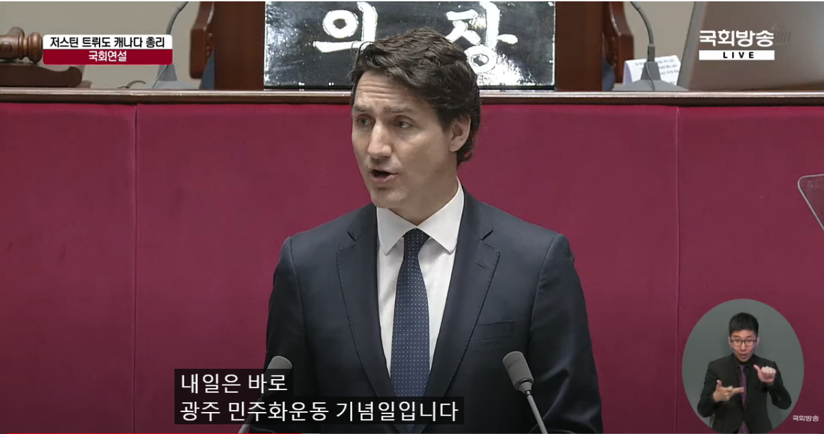 저스틴 트뤼도 연방 총리가 지난 16일~18일 한국을 방문, 17일 국회에서 연설하면서 5.18 민주화 운동에 대해 “민주주의를 얻기 위해 피와 희생을 통해 어렵게 이루어 낸 희망의 등불”이라고 칭송했다. 트뤼도 총리는 “18일이 광주민주화운동을 기념하는 아주 중요한 날이라는 것을 알고있다”고 언급하며 “43년 전 시민들이 마음 깊숙히 갖고 있던 민주주의에 대한 열망을 표현하기 시작했으며 투쟁 끝에 결국 자유가 승리해 한국의 민주주의를 달성할 수 있었다”고 평가했다.
