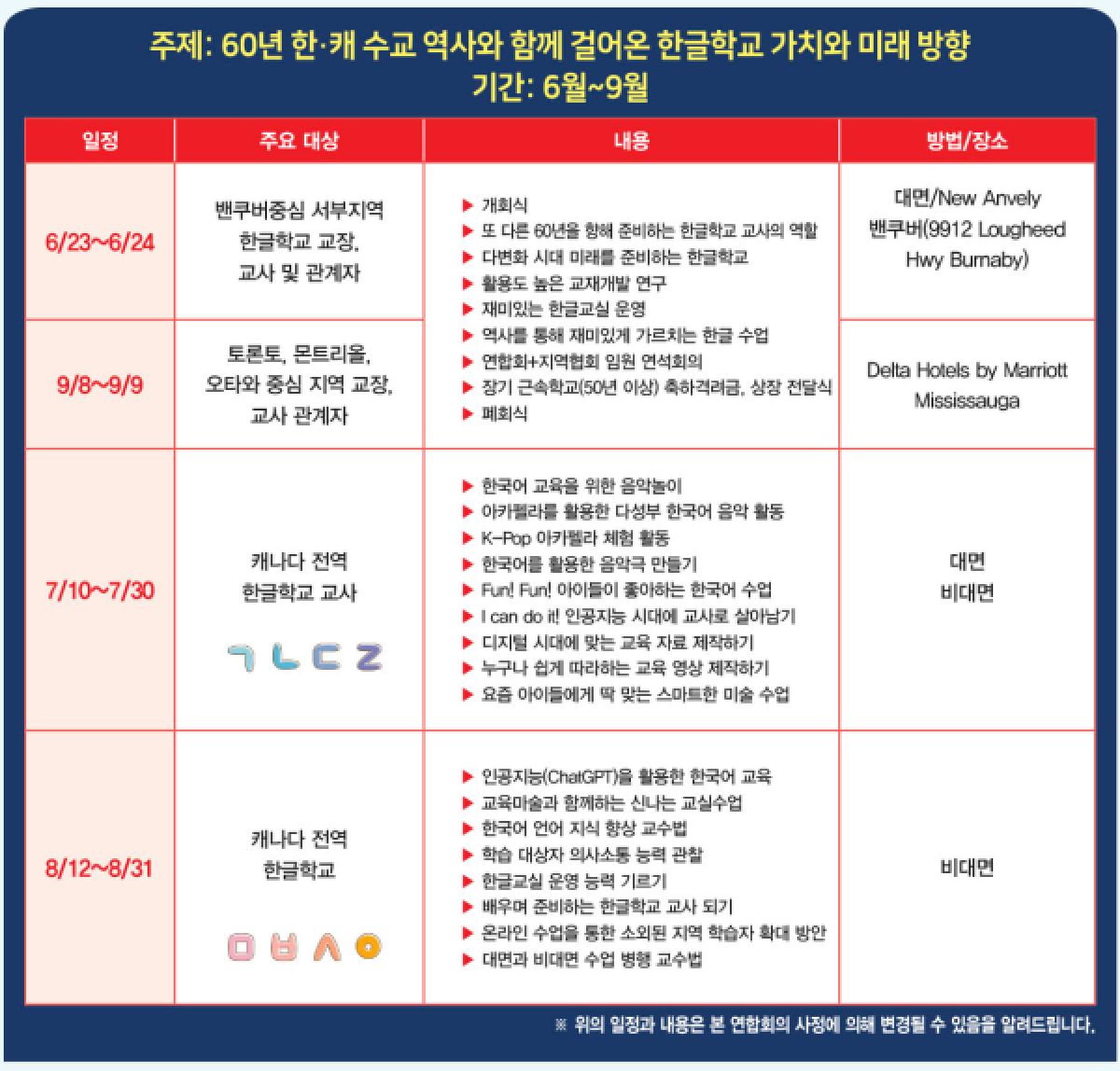 한-캐수교 60주년의 해를 맞아 ‘60년 한.캐 수교 역사와 함께 걸어온 한글학교 가치와 미래방향’이라는 주제로 여는 올해 학술대회 및 교사연수는 차세대의 눈높이 교육환경을 도입하도록 음악과 미술, 디지털 기술을 접목할 수 있는 연수 내용에 집중해 현장에서 생동감 있는 한글학교 운영에 목표를 두고 개최한다는 방침이다.