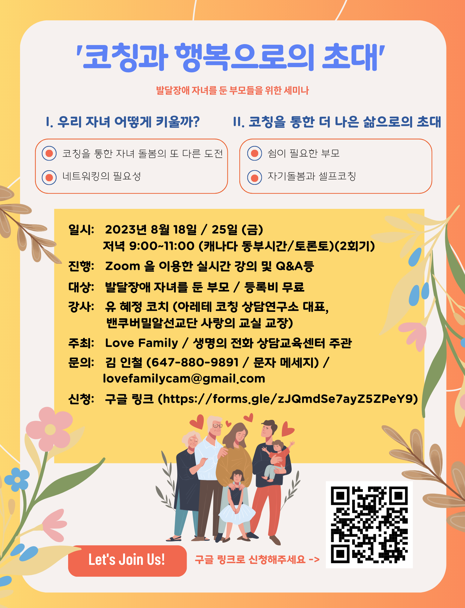 발달장애 자녀를 둔 부모들을 위해 ‘Love Family’와 ‘생명의 전화’상담교육센터가 공동으로 마련하는 ‘코칭과 행복으로의 초대’ 주제의 세미나가 오는 8월18일과 25일 금요일 저녁 2회에 걸쳐 온라인(Zoom)으로 무료 진행된다.