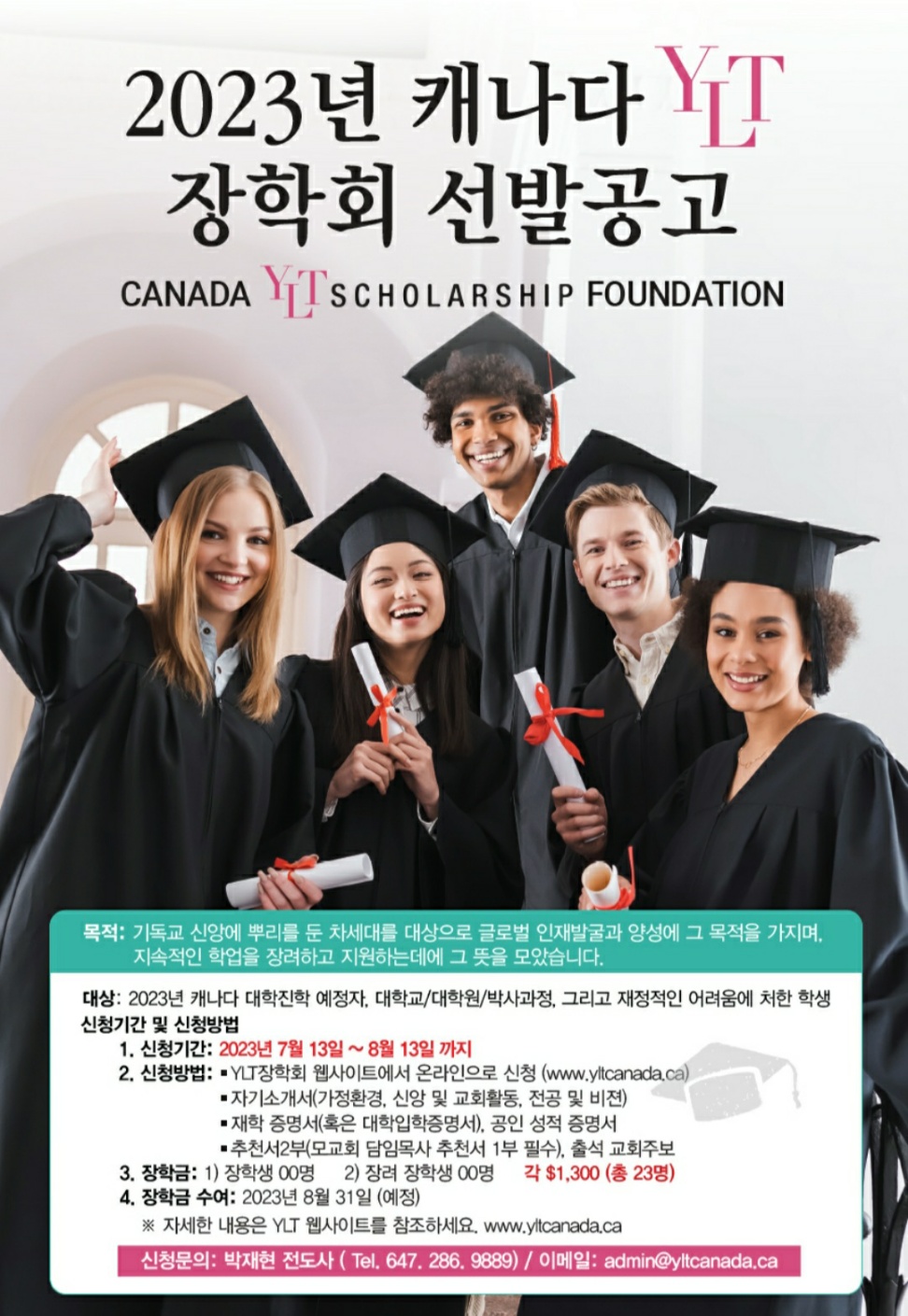 선발된 장학생에게는 8월31일 장학금을 수여할 예정이다. 자세한 사랑은 YLT 웹사이트, 혹은 박재현 전도사(647-286-9889)나 이메일 admin@yltcanada.ca로 문의하면 된다.
