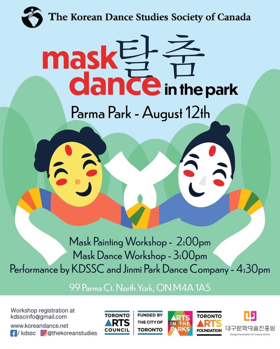 현편 한국무용연구회는 12일 Toronto Arts Foundation의 후원으로 Parma 공원에서 오후 2시부터 ‘Arts in the Park’ 프로그램 탈춤 워크샵을 진행한다. 이날 참여자에게는 무료로 plain mask를 제공한다. 탈춤은 한카수교 60주년 공연에 참여하는 한국 장요한 선생의 지도로 스텝을 배운 뒤 스스로 만든 탈을 쓰고 함께 탈춤을 추어보기도 할 수 있다.