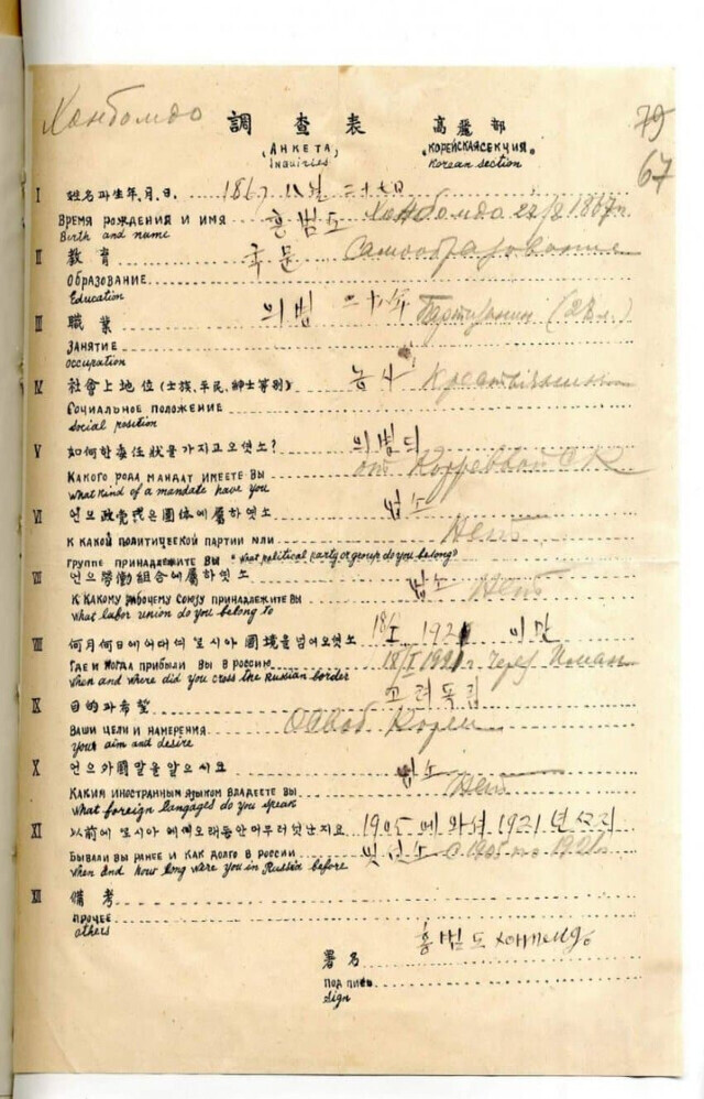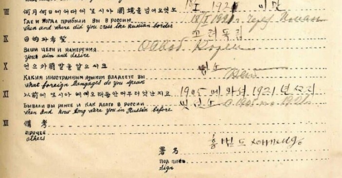 1922년 홍범도 장군이 모스크바에서 열린 극동민족대회에 참석하기 위해 소련에 입국하며 쓴 서류. 직업 ‘의병’, ‘목적과 희망’에 ‘고려독립’이라고 썼다. 이 입국조사서는 러시아 문서보관소에 있던 것으로 2021년 홍 장군 유해 봉환 당시는 물론 최근까지 트위터 등 사회관계망서비스(SNS)에서 널리 공유되고 있다.