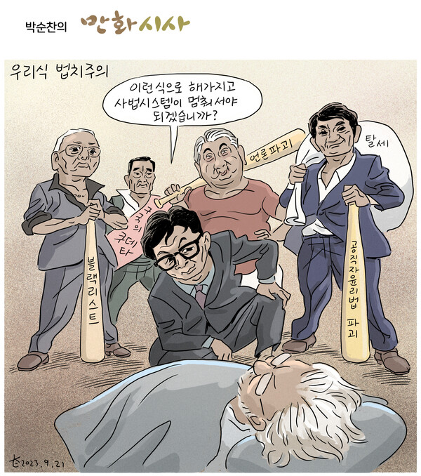 그런데 일제 강제동원 피해자들에 대해 일본기업의 배상책임을 인정한 최고법원의 판결을 묵살한 채 ‘제3자 보상’을 밀어붙이고, 최근에는 대법원이 유죄 확정했는데 3개월도 안돼 “법원판결이 잘못됐다”고 주장한 자를 특별 사면·복권시켜 보궐선거 재출마를 시킨 무법적 코미디가 벌어졌다. ‘시행령 정권’이라는 말도 상위법 무시를 지적한 말이다. 대통령이 나서서 비판 시민들을 공산-반국가세력이라 매도하고, 비판 언론에는 명예훼손 당했다고 고발한다. 한술 더 떠 “가짜뉴스” “괴담 제작소”라며 언론인을 “사형시켜야 한다”고 독설을 퍼붓는 민주국가 여당 대표를 본적이 없다. 특히 거대 야당의 대표를 출범이래 한번도 만나지 않고 범죄인 취급 적대시하면서, 손발처럼 부리는 검찰이 4백번 가까이 압수수색하고도 증거를 못잡아 몇 년째 특수수사로 괴롭히는 정권이 민주화 이후 있었던가. 더구나 단식 19일째 쇠진해 입원한 날 그 야당대표를 기어이 구속해 보겠다고 영장을 청구한 잔인무도의 극치를 21세기 ‘민주’국가에서 보고들 있으니… 정적 취급에도 금도가 있는 법이다. 하물며 선열들의 피끓는 민주항쟁으로 오늘까지 지켜 온 나라가 아닌가.< 편집인 >