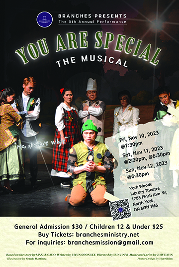 기독인 극단 브랜치스(단장 이현순)가 제5회 2023 정기공연으로 맥스 루케이도 작 ‘You are Special’을 뮤지컬로 만들어 오는 11월10일(금)~12일(일) York Woods Library Theatre(1785 Finch Ave. W., North York, M3N 1M6)에서 무대에 올린다.