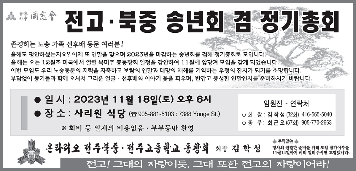 온타리오 전주고등학교 동창회(회장 김학성)가 2023 정기총회 및 송년회를 11월18일(토) 오후 6시 쏜힐 사리원식당에서 개최한다.