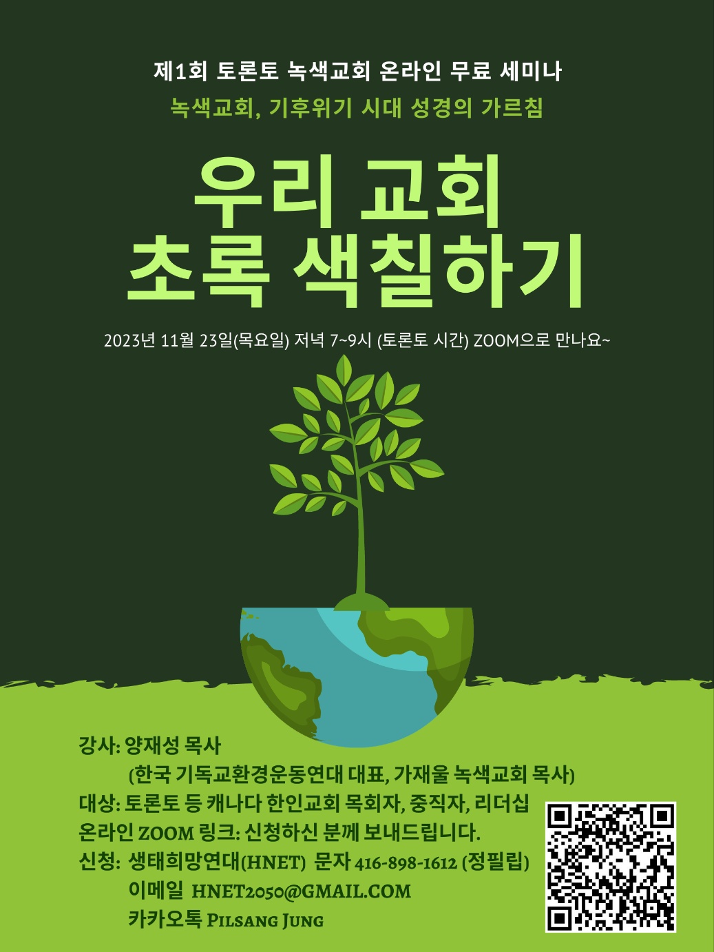 토론토 생태희망연대(HNET)는 기후위기 시대 성경의 가르침을 되짚어보는 녹색교회 온라인 세미나 ‘우리교회 초록 색칠하기’를 11월23일(목) 저녁 7시부터 기독교환경운동연대 대표 양재성 목사를 강사로 진행한다.