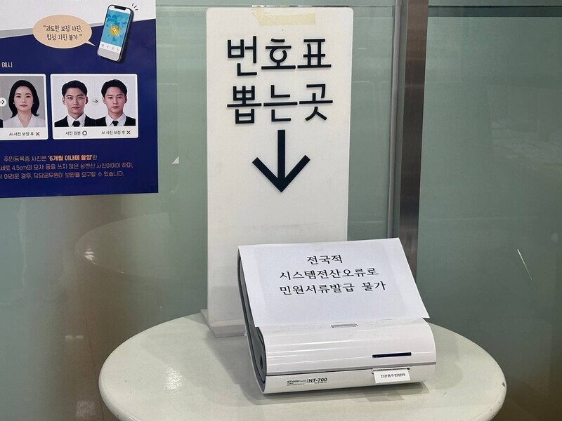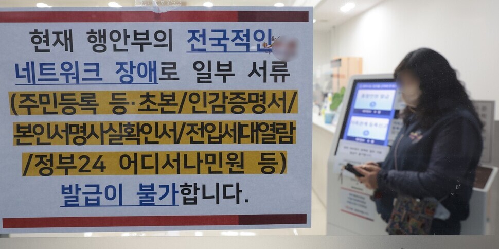 재발급 받은 자신의 주민등록증을 수령하러 온 시민도 전산 문제 탓에 찾아가지 못했다고 한다. 전자 서명과 지문의 진위를 전산으로 확인한 뒤에야 배부가 가능하기 때문이다. 주민센터 직원 ㄱ씨는 “임시 주민등록증을 발급해드렸고, 추후 다시 수령하러 오시라고 안내해드렸다”고 말했다.화장터에 고인이 된 가족을 보내야 하는데 주민등록초본이 떼어지지 않아 난감해하는 시민도 있었다. 임시 서류에라도 도장을 찍어달라고 호소했지만, 주민센터 쪽에선 공문서가 아닌 임시 서류에 도장을 찍긴 어렵다고 거절했다.이아무개(56)씨는 “오늘부터 남편 장례를 시작했다. 서류가 필요해 아침부터 여러 차례 왔는데 계속 발급이 안 된다”며 “화장이 일요일 아침이라 오늘이 아니면 방법이 없다. 망자의 마지막 길을 망치는 상황이 될까 무섭다”고 말했다.