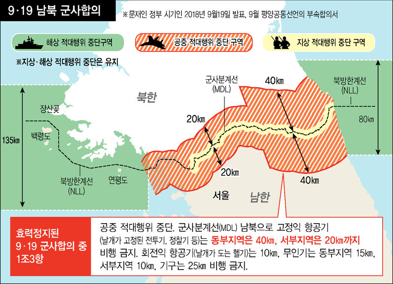.2018년 남북이 접경지역에서 우발적 군사 충돌을 막기 위해 땅·바다·하늘에 완충구역을 두기로 합의한 9·19 남북군사합의(9·19 군사합의) 일부 내용이 5년 만에 무력화됐다.
