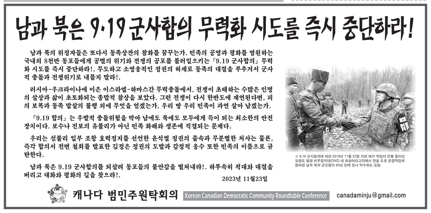 “‘9.19 합의’는 우발적 충돌위험을 막아 남에도 북에도 모두에게 득이 되는 최소한의 안전장치로, 보수나 진보의 유불리가 아닌 민족 화해와 생존에 직결되는 문제”라고 강조한 성명에서 원탁회의는 “섣불리 일부 조항 효력정지를 선언한 윤석열 정권의 졸속과 무분별한 처사는 물론, 즉각 합의서 전면 철회를 발표한 김정은 정권의 도발과 감정적 응수 또한 민족의 이름으로 규탄한다.”고 남북 모두를 비판했다. 범민주원탁회의는 이어 “남과 북은 9.19 군사합의를 되살려 동포들의 불안감을 떨쳐내라!. 하루속히 적대와 대결을 버리고 대화와 평화의 길을 찾으라!”고 강하게 촉구했다. < 문의: canadaminju@gmail.com >