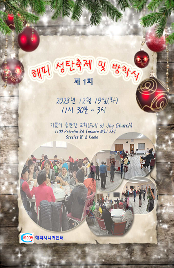 노년의 신체와 정신건강을 돕고 행복한 노후생활을 뒷받침하는데 주안을 준 봉사단체 ‘해피 시니어센터’(회장 최춘해)가 12월19일(화) 오전 11시30분부터 오후 3시까지 ‘제1회 성탄축제 및 방학식’을 기쁨이 충만한교회(1100 Petrolia Rd. M3J 2X4: 담임 양요셉 목사)에서 개최한다.