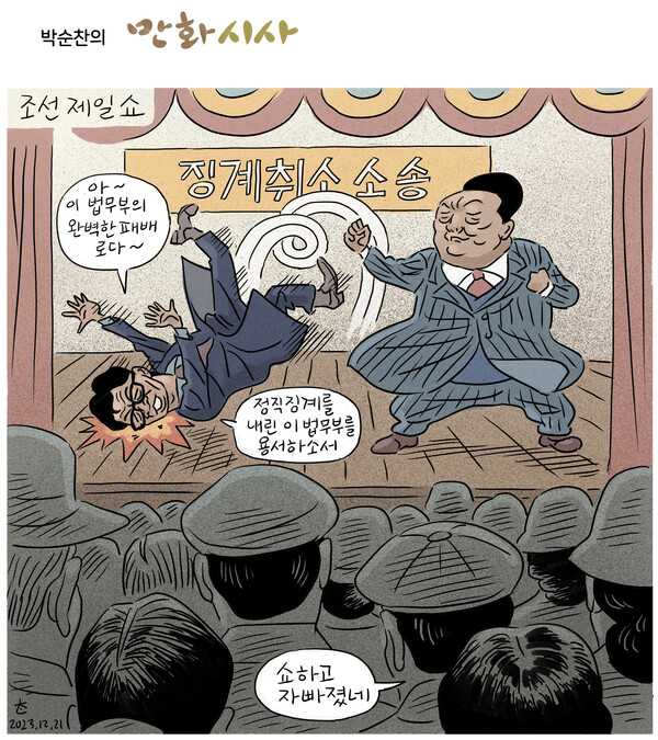 윤석열이 자신을 검찰총장 시절 ‘채널A 사건 감찰 및 수사 방해’ 등으로 징계한 처분이 잘못됐다며 제기한 소송의 피고가 채널A 사건의 당사자인 한동훈의 법무부인 재판이 ‘역시나’로 선고된 전말도 그 대표적 코미디의 하나로 손색없이 등극했다. 원고와 피고가 ‘형님 아우’인 한통속이니 짜고치는 게임이라는 예상을 적중시킨 법기술에, 법원까지 주눅들어 맞장구를 치고나온 사법코미디의 결정판을 선보인 것이다.