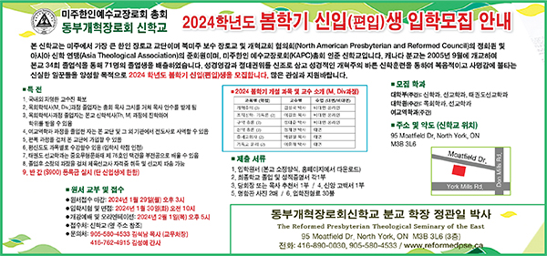 미주 한인예수교장로회 총회(KAPC) 직영 동부개혁장로회 신학교 캐나다분교(학장 정관일 박사)가 2024학년도 봄학기 신입생을 1월29일(월)까지 원서를 접수해 모집한다.