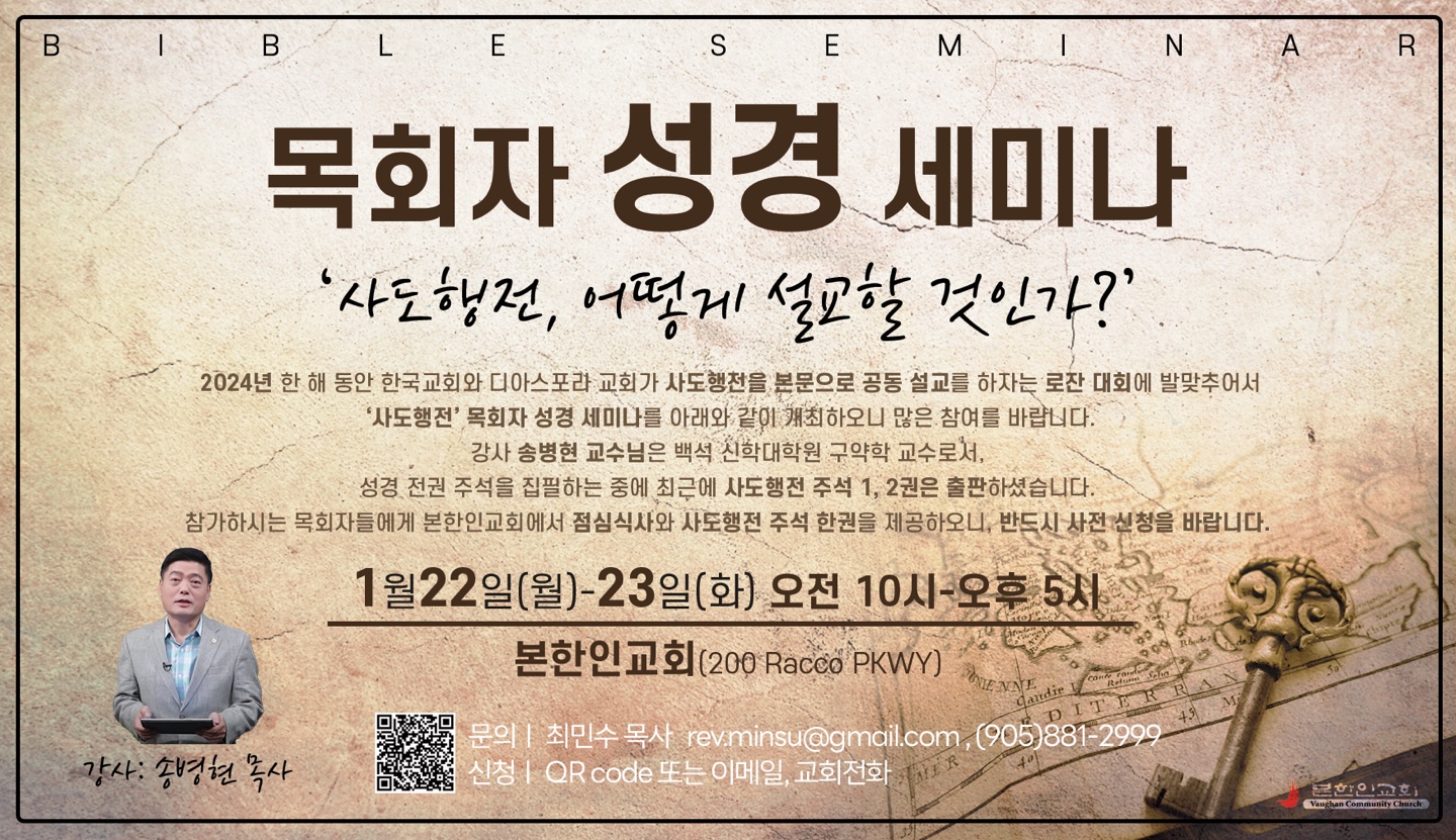 본 한인교회가 1월19~21일 열리는‘2024 말씀사경회’초청 강사로 집회를 인도하는 송병현 목사를 강사로 하는 목회자 성경 세미나를 1월22일(월)과 23일(화) 이틀간 개최한다.