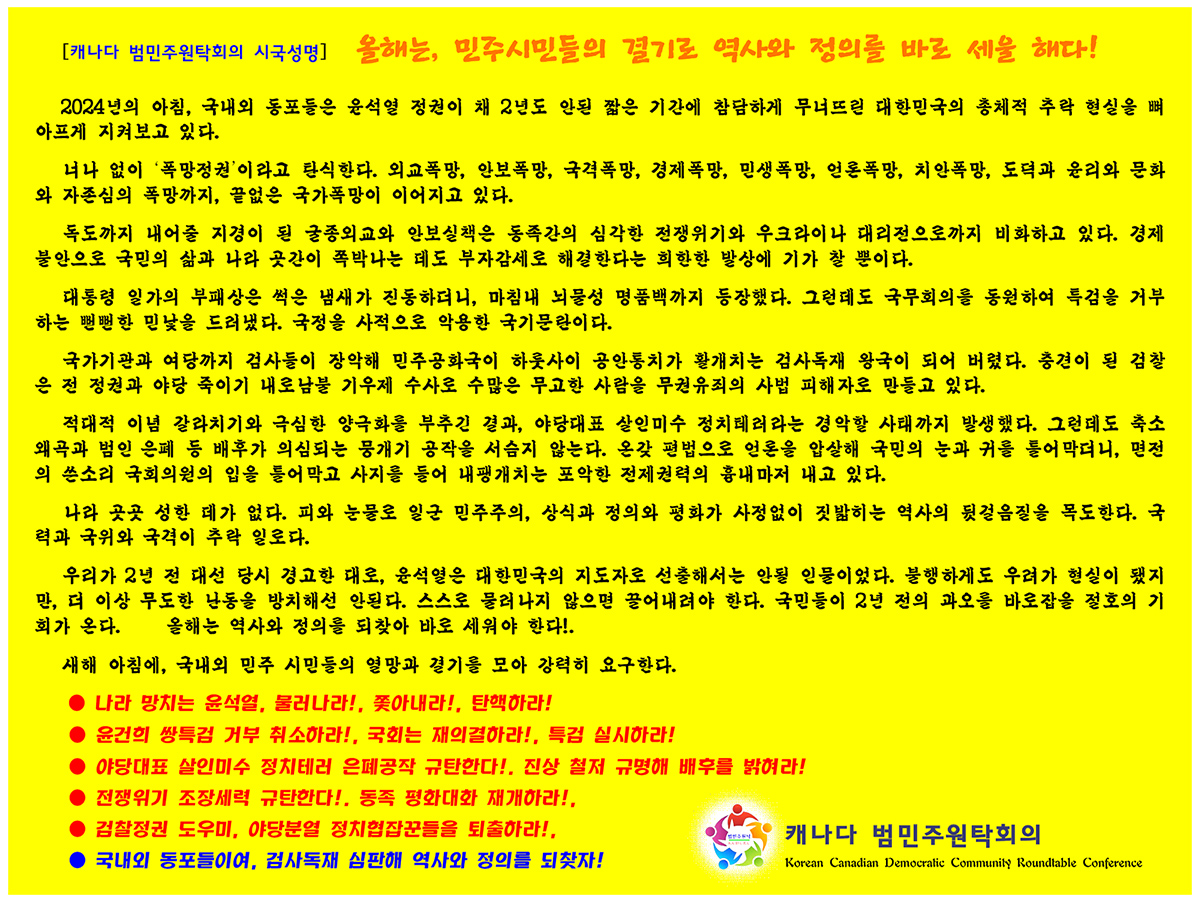 캐나다 범민주원탁회의(Korean Canadian Democratic Community Roundtable Conference)가 새해 초 시국성명을 발표, 윤석열 정권의 총체적 난맥상을 비판하고 “올해는 역사와 정의를 되찾아 바로 세우는 해가 되어야 한다”고 강조했다.