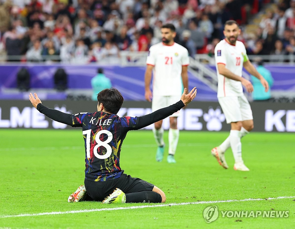 이강인이 요르단 페널티 박스에서 모하마드 아부 하쉬쉬의 태클에 넘어진 뒤 심판이 파울을 불지 않자 항의하고 있다.
