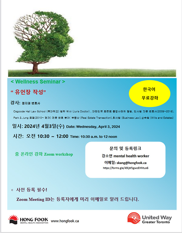 홍푹 정신건강협회는 오는 4월3일(수) 유언장 작성에 관한 웰니스 세미나를 온라인으로 개최한다.