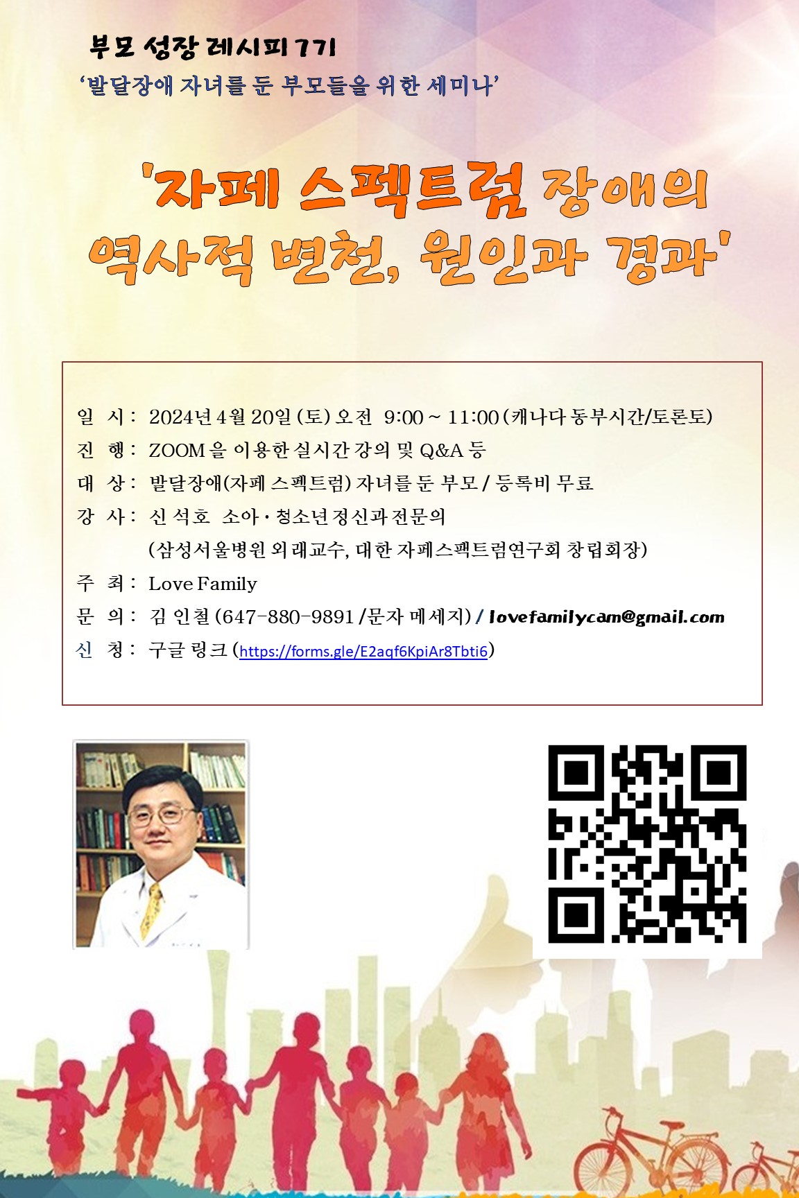 사회봉사단체인 Love Family가 주최하는 ‘발달장애 자녀를 둔 부모들을 위한 세미나- 자페 스펙트럼 장애의 역사적 변천, 원인과 경과’를 주제로 한 온라인 세미나가 4월20일(토) 오전 9시부터 11시까지 2시간 동안 온라인 ZOOM을 이용해 무료로 진행된다.