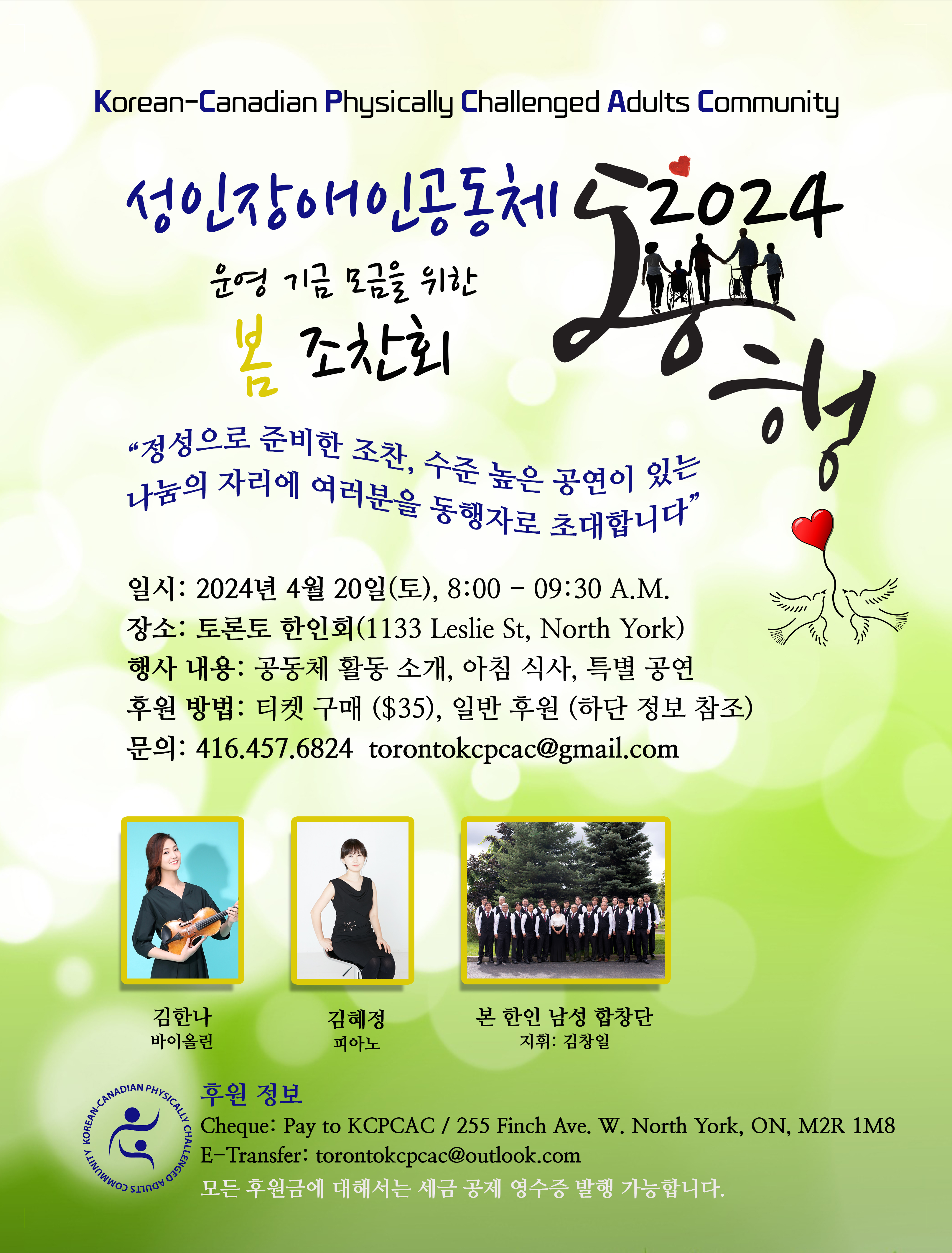 성인장애인 공동체는 “단체 운영에 있어 중요한 행사로, 올해도 봉사자들이 직접 준비하는 아침 식사와 수준 높은 무대 등을 준비하고 있다. 많은 분들이 오셔서 공동체 장애 회원들과 함께 동행해 주실 것을 정중히 요청드린다”면서 “조찬모금회와 여타 후원에 적극 참여하셔서 사랑으로 동행해 달라”고 거듭 따뜻한 성원을 당부했다. < 문의: 416-457-6824, torontokcpcac@gmail.com >