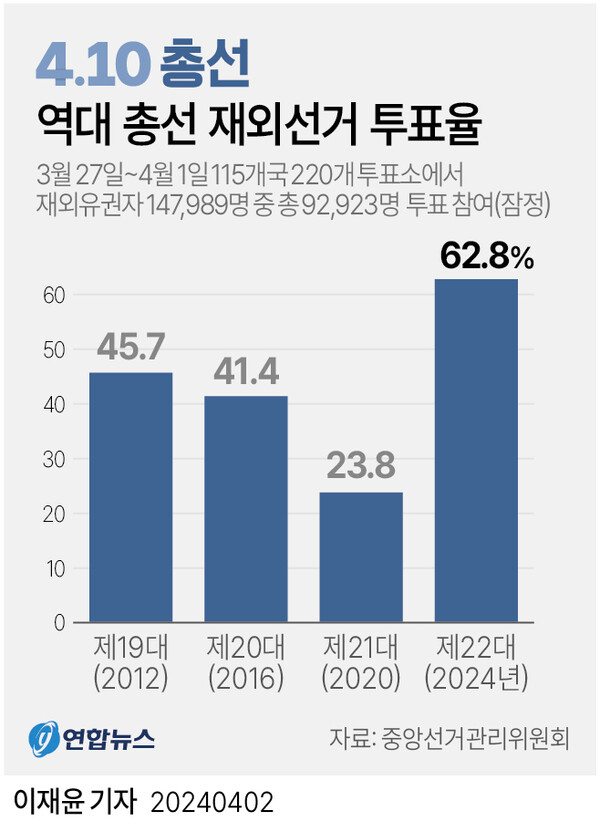 제22대 국회의원 총선거 재외국민 투표율이 역대 총선 최고치를 경신했다.