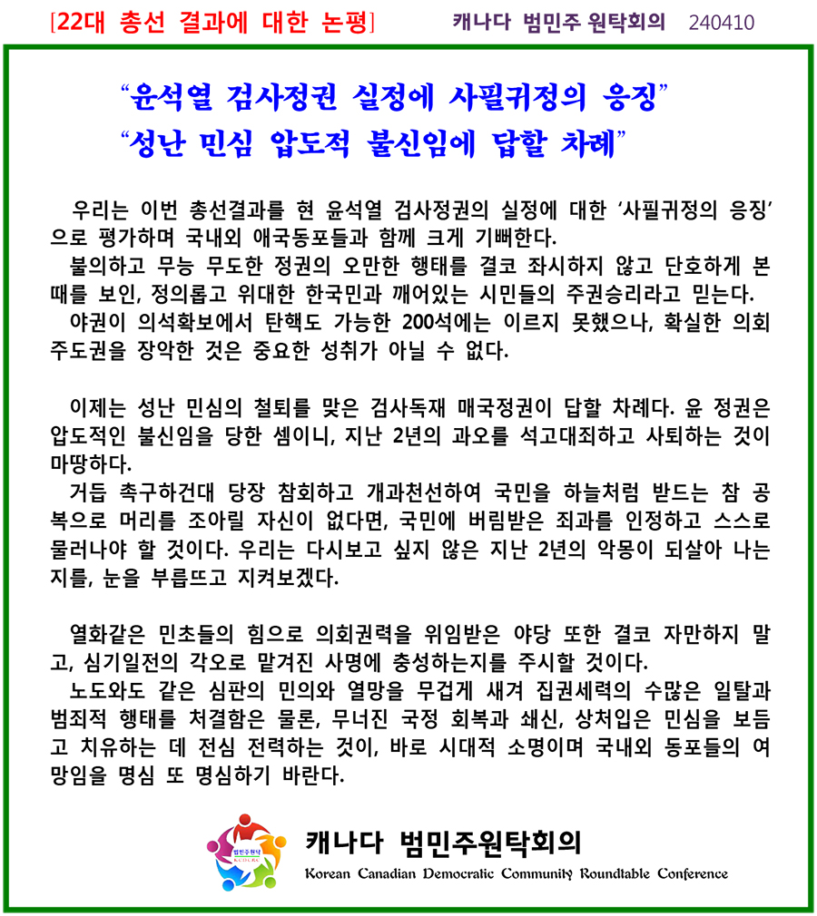 캐나다 범민주원탁회의(KCDCRC: Korean Canadian Democratic Community Roundtable Conference)는 모국 4.10 총선 결과에 대해 “현 윤석열 검사정권의 실정에 대한 사필귀정의 응징”이라며 “불의하고 무능 무도한 정권의 오만한 행태를 결코 좌시하지 않고 단호하게 본 때를 보인, 정의롭고 위대한 한국민과 깨어있는 시민들의 주권승리”라고 평가했다.