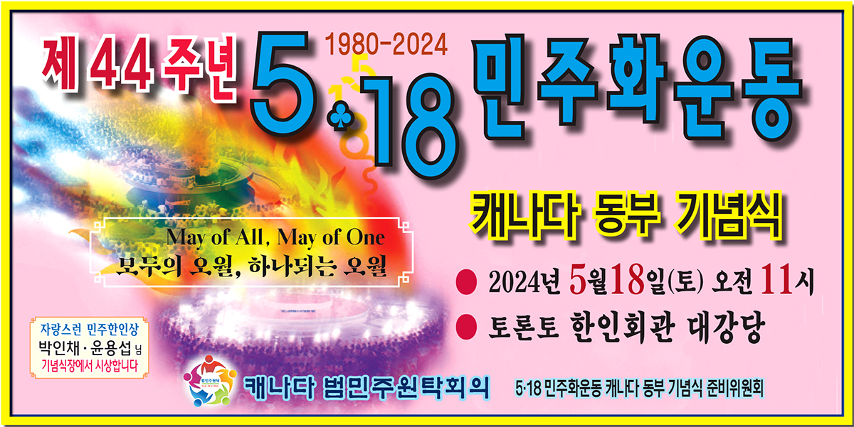 모국 국가기념일이며 세계기록유산인 5.18 민주화운동 제44주년 캐나다 동부 기념식이 오는 5월18일(토) 오전 11시 토론토 한인회관 대강당에서 토론토 한인회와 주요 동포단체, 한국대사관과 총영사관 등의 후원으로 열린다.