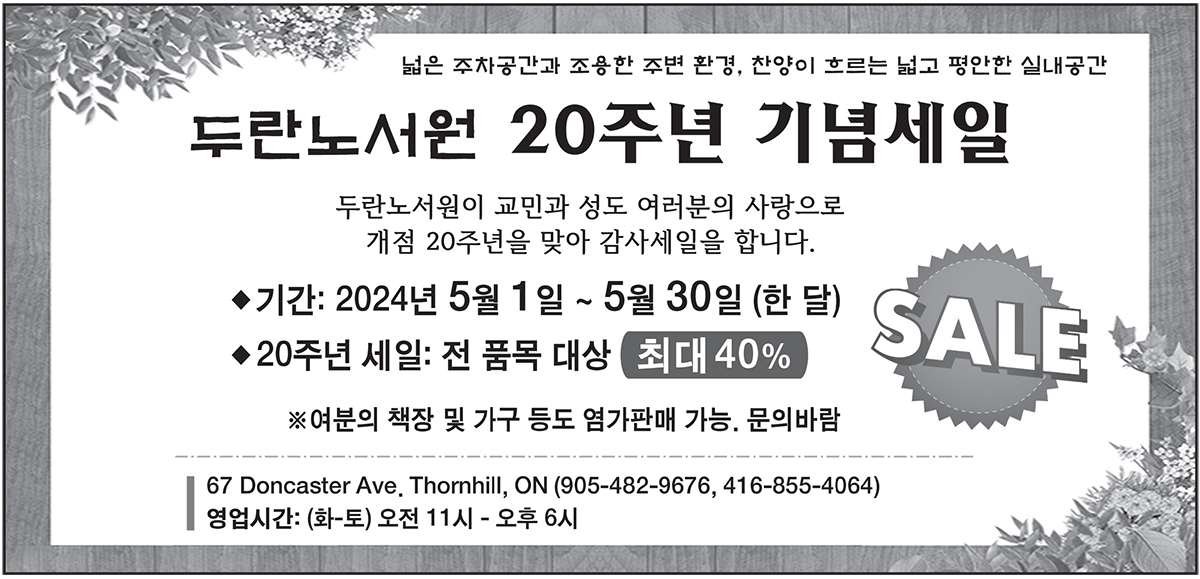 일반서적은 물론 기독서적과 크리스천 물품을 전문 취급하는 쏜힐 두란노서원(67 Doncaster Ave.)이 개점 20주년을 맞이해 5월1일부터 30일까지 한 달 동안 특별 감사세일을 실시한다.