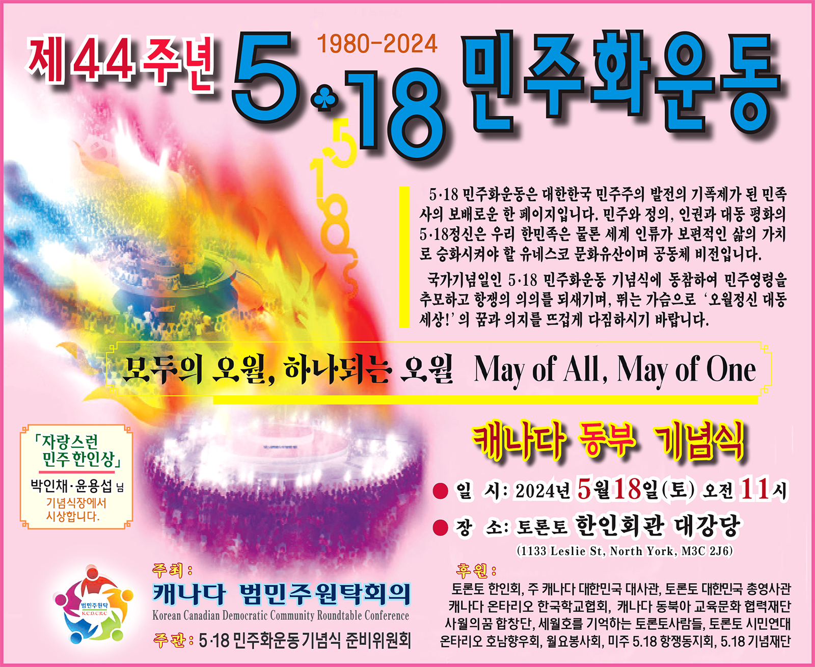 무고한 시민을 향해 뭉둥이질에 대검과 총탄, 헬기사격까지 자행한 전두환 쿠데타 세력의 짐승같은 만행과 달리 광주시민들은 의분의 항거 속에서도 질서를 지켰고, 나눔과 베품과 희생으로 민주주의와 ‘대동세상’의 비전을 보였다는 사실. 그것은 동학혁명 때도, 3.1혁명 때도, 4.19에도, 그리고 지난 6.10과 촛불혁명 때도 볼 수 있었던 우리 민족의 근성이고 저력이었다. 올해 5.18 항쟁 44주년 기념식을 통해 그 정신을 되새기며, 여전히 흐르고 있을 저항의 피와 혼, 정의로운 기개를 생각한다. 그리고 지금의 한국 정권이 드러내고 있는 말기적 증상을 떠올리게 된다. 나라의 경제와 외교는 삼류국으로 전락하고, 민생은 도탄지경인데, 권력방어에 몰두해 국가기관을 총동원하고 있다. 일가 비리를 덮으려 공권력을 사유화하고 거부권을 남발하는 후안무치와 법치유린-. 5.18 기념식에 몸은 참석했다 하나, 허언으로 장식한 기념사와 식장 안팍의 원성들을 보노라면 민중의 분노와 외침을 ‘개짖는 소리’쯤으로 여겼던 불행한 역사의 권력자들이 오버랩 된다. 깨어있는 시민들이 주말마다 경고의 촛불을 켜들었고, 지난 4.10 총선에서 거듭 적신호를 주었다. 임계점에 이른 국민의 의분을 거슬러 무슨 험한 꼴을 당할 작정인가.