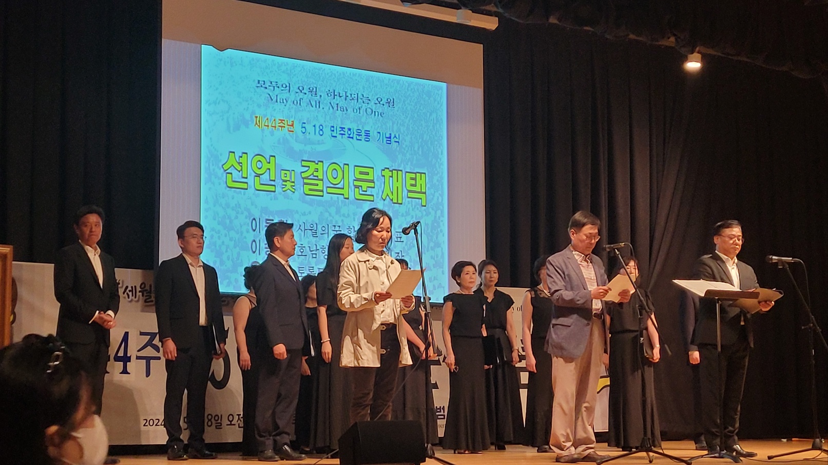 ‘산 자여 따르라!’는 제목의 선언 및 결의문은 “5.18 항쟁의 의의와 정신은 세계인류가 인정하는 우리 민족의 자부심”이라고 전제, “그러나 오늘 우리는 부끄러움을 안고 이 자리에 섰다. 벌써 44년이 흘렀지만, ‘산자여 따르라’고 외친 열사들이 마음 편히 안식할 시대는 여전히 신기루처럼 어른거릴 뿐 먹구름에 싸인 현실이 암담하기만 하다.”고 지적했다. 이어 “5.18 정신 구현의 시대적 책무와 역사적 소명을 되새겨 불의한 행태와 퇴행에 결연히 맞서며, 정의롭고 평화로운 대동세상의 꿈을 실현하기 위해 결의하고 강력히 촉구한다”고 강조, 참석자들과 함께 5개항을 채택했다.