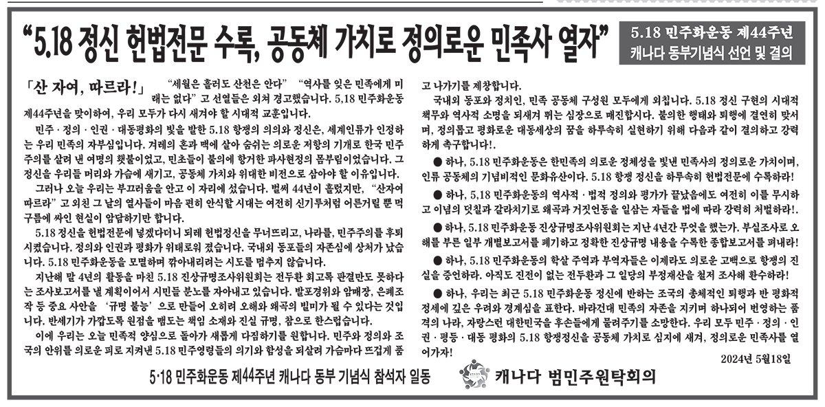5.18 민주화운동 제44주년 캐나다 동부 기념식 선언 및 결의문