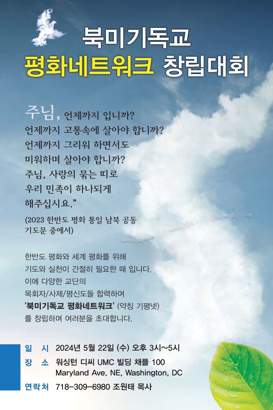 한반도와 세계의 평화를 위해 기도하고 실천하기 위한 기독인 모임인 ‘북미 기독교 평화 네트워크’(Korean Ecumenical Peace Network)가 지난 5월22일 미국 워싱턴DC 소재 연합감리교회에서 40여명의 목회자와 평신도 등이 참석한 가운데 창립예배와 총회를 열고 본격 출범했다. 창립 공동 발기인에는 천주교 신부를 포함해 20개 교단 소속 120명이 참여했다고 주최측이 밝혔다.