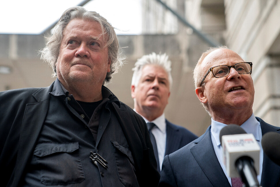 2016년 트럼프를 대통령으로 만들고 백악관까지 따라 들어가 브레인 역할을 했던 극우 전략가인 스티브 배넌 전 백악관 수석 전략가가 트럼프 유죄 평결에 시간을 맞춰 수천 명의 극우 팝캐스터들을 동원했다. 배넌은 2019년 백악관을 나온 뒤부터 워싱턴 연방의사당에서 두 블럭 거리의 낡은 주택 지하실에 상황실(War Room)을 만들었다. 그곳에서 그는 유튜브 방송을 운영하는 데 거의 6백만 명의 시청자를 갖고 있다. 그는 연방하원 내부의 ‘마가(MAGA·미국을 위대하게) 전사’(트럼프 전사) 의원들을 조직했다. 현직 극우파 의원들을 방송에 출연시켜 지지자들로부터 한 번에 수십만 달러를 모금해주는 미끼를 마다할 의원이 없다. 트럼프로부터 독립하려던 공화당의 2인자 캐빈 매카시를 하원의장에서 쫓아낸 장본인이 배넌이다. 그의 이 유튜브 방송에 단골로 출연하는 극우파 현직 하원의원들이 배넌의 조정을 받아 매카시를 하원의장 자리에서 축출했다.