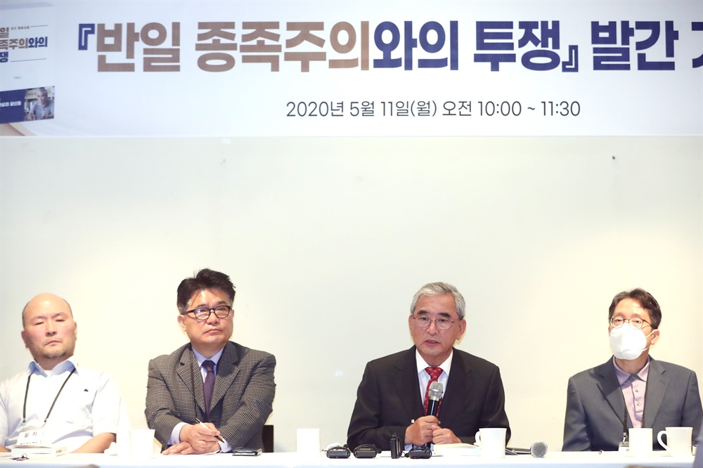 ▲ 2020년 5월 11일 중구 한 식당에서 열린 <반일 종족주의와의 투쟁> 발간 기자회견에서 대표저자인 이영훈 전 서울대 교수가 발언하고 있다. ⓒ 연합