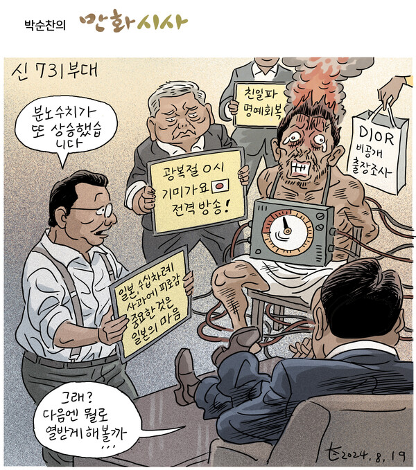 이들은 이명박 정권 이후 세를 넓혀나가다가 윤석열 정권에서 전성시대를 맞고 있다. 정부 곳곳에 친일극우세력이 똬리를 틀고 역사쿠데타를 벌이는 중이다. 동북아역사재단, 국사편찬위원회, 한국학중앙연구원, 그리고 마침내 독립기념관장 자리마저 ‘친일파의 명예회복’을 주장하는 인물이 점령했다. 그리고 광복회장을 ‘일본 극우의 기쁨조’라고 매도했다. 친일을 나무라는 독립지사의 후손을 ‘기쁨조’라니, 실제로 일본 극우와 일심동체가 되어버린 자신들을 빗댄 고백이 아닌가.