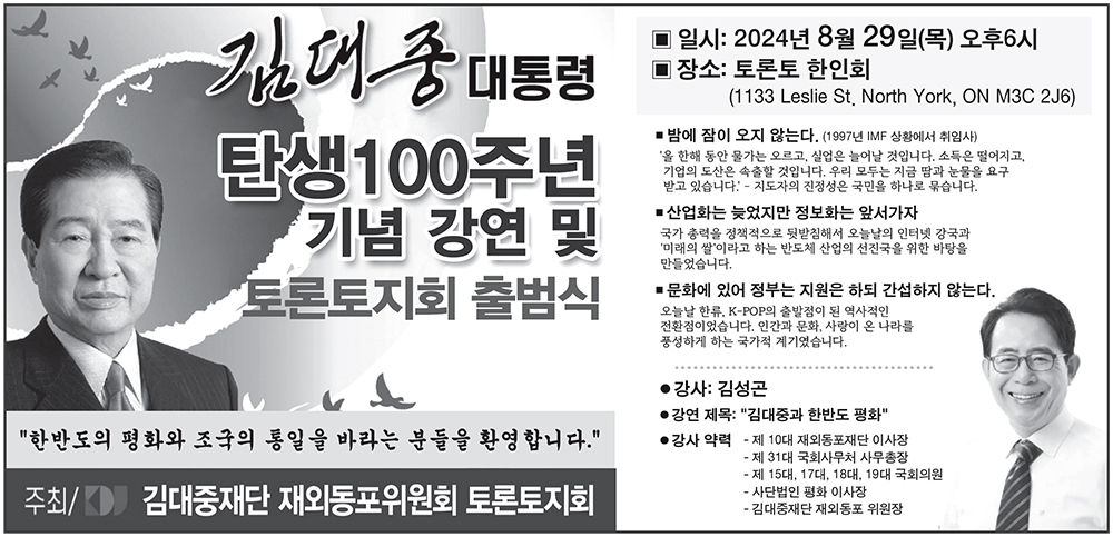 김대중 대통령 탄생 100주년 기념 강연 및 김대중재단 재외동포위원회 토론토지회 출범식이 8월29일(목) 오후 6시 토론토 한인회관에서 열린다.