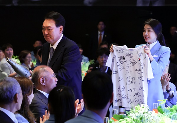 ▲ 성화봉·티셔츠 선물받은 윤석열 대통령 부부 윤석열 대통령과 김건희 여사가 22일 서울 한 호텔에서 열린 '2024 파리올림픽 선수단 격려 행사'에서 탁구 전지희 선수로부터 파리올림픽 선수들이 사인한 성화봉과 티셔츠를 선물받고 있다.