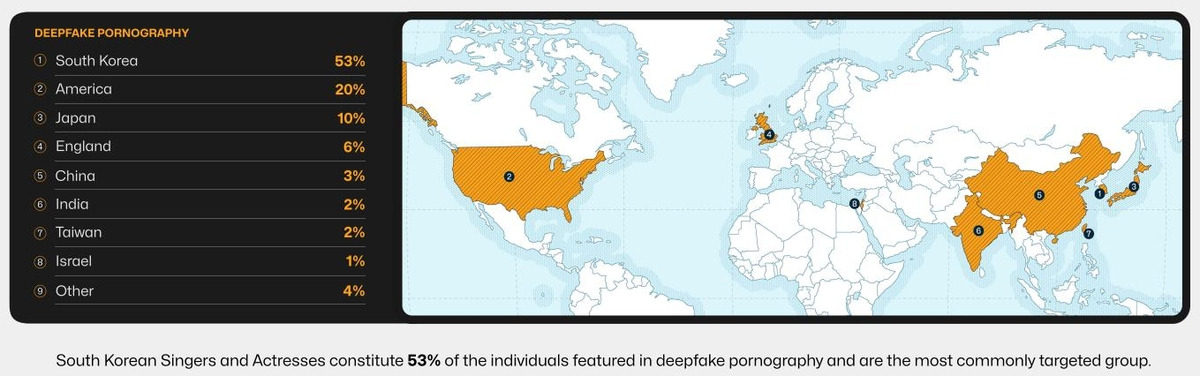 그 결과 딥페이크 음란물에 등장하는 개인 중 53%가 한국인으로 나타났다.