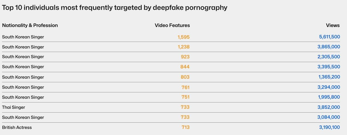 보고서는 또 딥페이크 음란물의 최다 표적이 된 개인 10명을 꼽았는데 이 중 8명이 한국인 가수였다. 1∼7위와 9위가 한국 가수였고 8위는 태국 가수, 10위는 영국인 배우였다. 보고서는 사안의 민감성을 고려해 피해자의 이름은 밝히지 않았다.