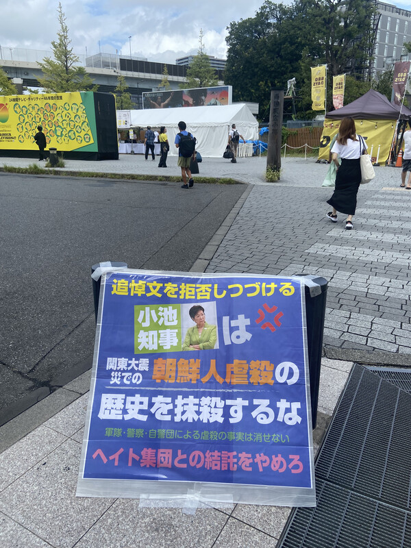 고이케 유리코 도쿄도지사는 올해도 조선인 희생자 추도식에 추도문을 보내지 않았다. 2017년부터 8년째다. 이전의 역대 도쿄도지사들은 학살당한 사람들 추도식에 추도문을 보냈으며, 우익 이시하라 신타로도 지사 재임 시절 추도문을 보냈다. 2016년에 단 한 번 추도문을 보냈을 때 고이케 지사는 추도사에서 “불행한 일을 두 번 다시 되풀이하지 말고, 누구나 안전한 사회생활을 영위할 수 있도록 세대를 넘어 계속 얘기해야 합니다”라고 했다.