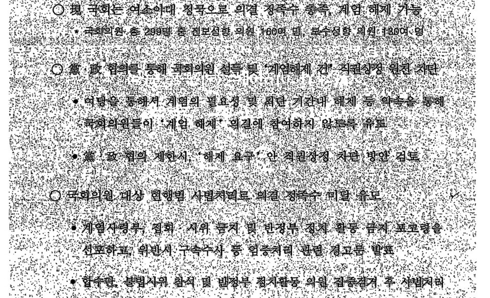 그러나 당시 작성된 계엄령 검토 문건 내용은 △계엄 선포 △단계별 조치 △계엄 시행 준비 착수일까지 자세히 담고 있었다. 박근혜 당시 대통령 탄핵이 기각될 경우 군이 탱크 등을 동원해 서울 광화문 촛불시위 등을 진압하고, 국회가 계엄 해제를 시도할 경우 의결정족수를 미달시키기 위해 국회의원을 체포·구금하는 계획까지 구체적으로 담았다.