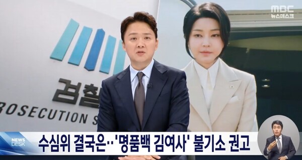 MBC는 또 “반쪽짜리 수사심의위 논란도 이어질 수 있다. 역대 수사심의위는 수사팀 의견과 반대되는 쪽이 참여를 했으나 이번에는 처벌을 감수하겠다는 최재영 목사는 빠지고 무혐의를 주장하는 김 여사 측과 검찰만 참석했다”고 지적했다. MBC는 그러나 “공수처에도 이 사건이 고발돼 있어 언제든 수사가 시작될 수 있다”고 했으며 “야권은 김 여사 특검을 벼르고 있는데, 불기소로 이어지면 특검 여론이 높아질 가능성도 있다”고 밝혔다.