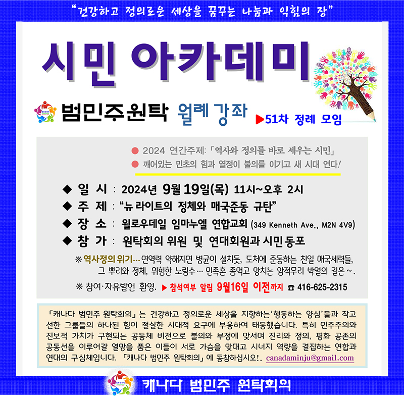 캐나다 범민주원탁회의(Korean Canadian Democratic Community Roundtable Conference)가 9월 연합모임을 겸한 월례 「시민 아카데미」의 제51차 강좌를 9월19일(목) 오전 11시부터 노스욕 윌로우데일 연합교회(349 Kenneth Ave. M2N 4V9)에서 시사한겨레 신문사 후원으로 개최한다.