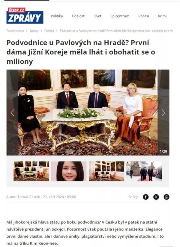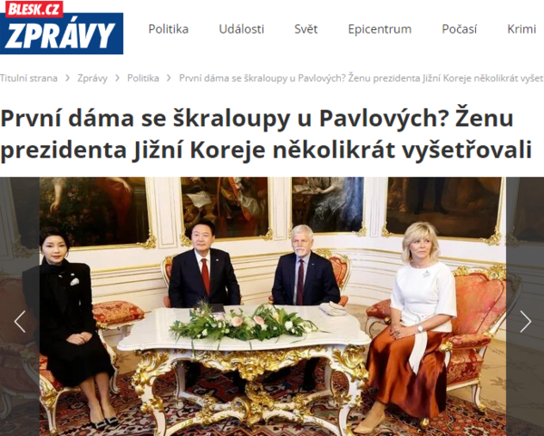 기사에서 블레스크는 “윤석열 대통령은 20일 체코 공화국을 국빈 방문했다. 그러나 그의 부인 또한 주목을 끌었다”면서 “우아함은 그 퍼스트레이디(대통령 부인)에 속하지만, 탈세와 표절 또는 날조된 연구 의혹도 역시 그녀에게 속해 있다”고 지적했다.
