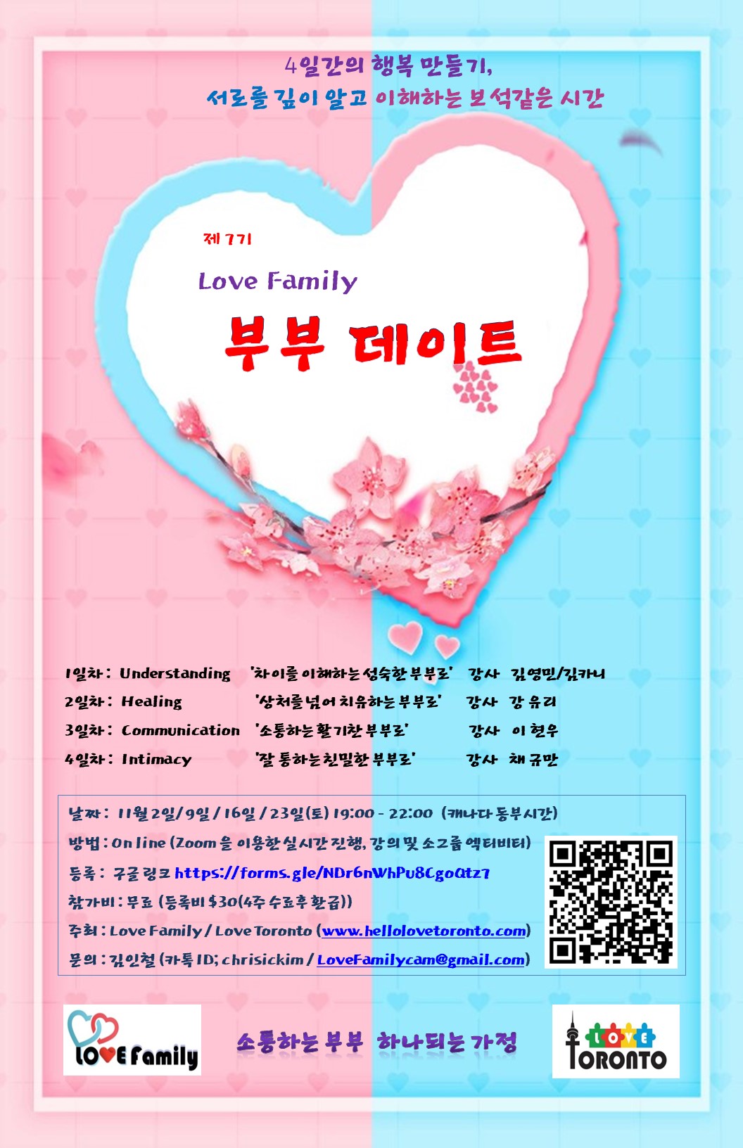 Love Family가 주최하는 ‘4일 간의 행복 만들기’부부 데이트 제7기 온라인 강좌가 오는 11월2일(토)부터 4주간 무료로 진행된다.