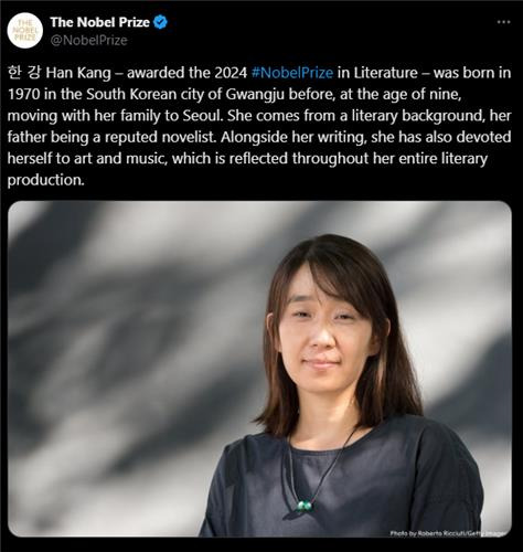 노벨위원회는 이날 엑스(X·옛 트위터) 계정을 통해 한강의 이력과 주요 작품을 상세히 영어로 소개했다.