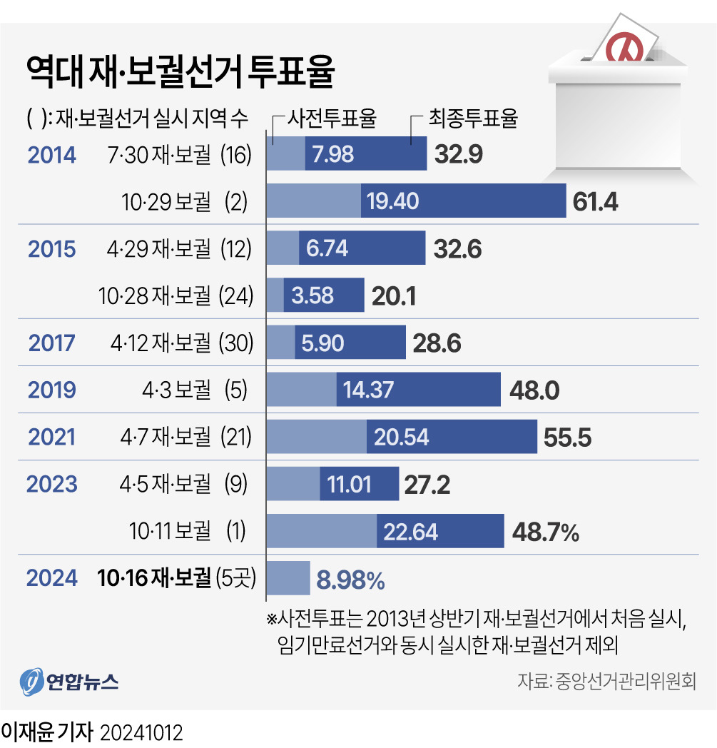 10·16 재·보궐선거 최종 사전투표율이 12일 8.98%로 집계됐다.