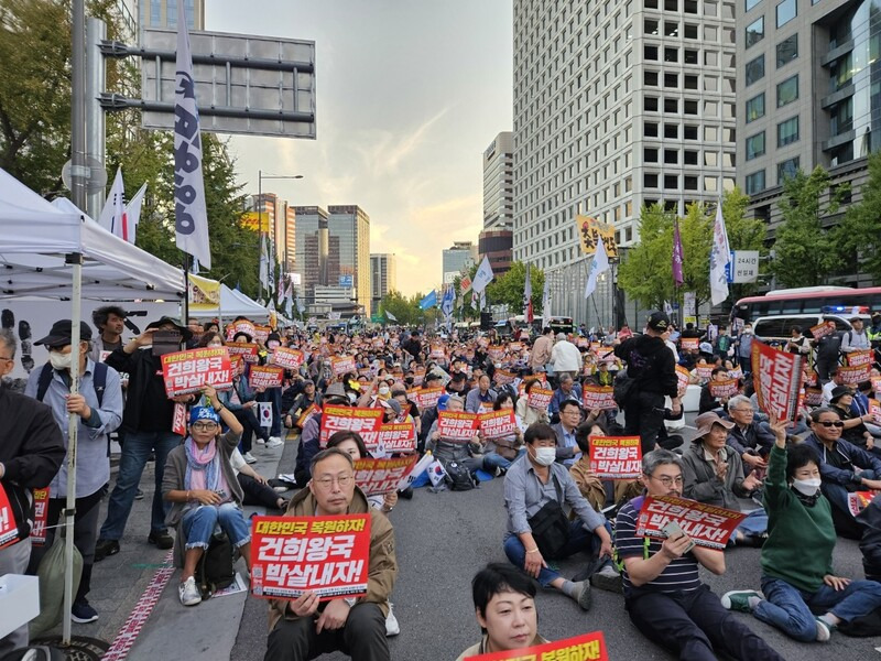 한편 촛불행동이 매주 서울 도심에서 여는 대통령 퇴진 집회는 최근 김건희 여사 주가 조작 의혹에 대한 검찰의 무혐의 처분과 맞물리며 세를 불리는 모양새다. 지난 19일 오후 열린 ‘윤석열 퇴진 김건희 특검 111차 촛불대행진 10월 전국 집중 촛불’ 집회에는 1만2천여명(주최 쪽 추산)이 참석해 숭례문 방향 4차선 도로 170m가량을 메우고 ‘윤 대통령 퇴진’ 구호를 외쳤다. < 김가윤 임재희 기자 >