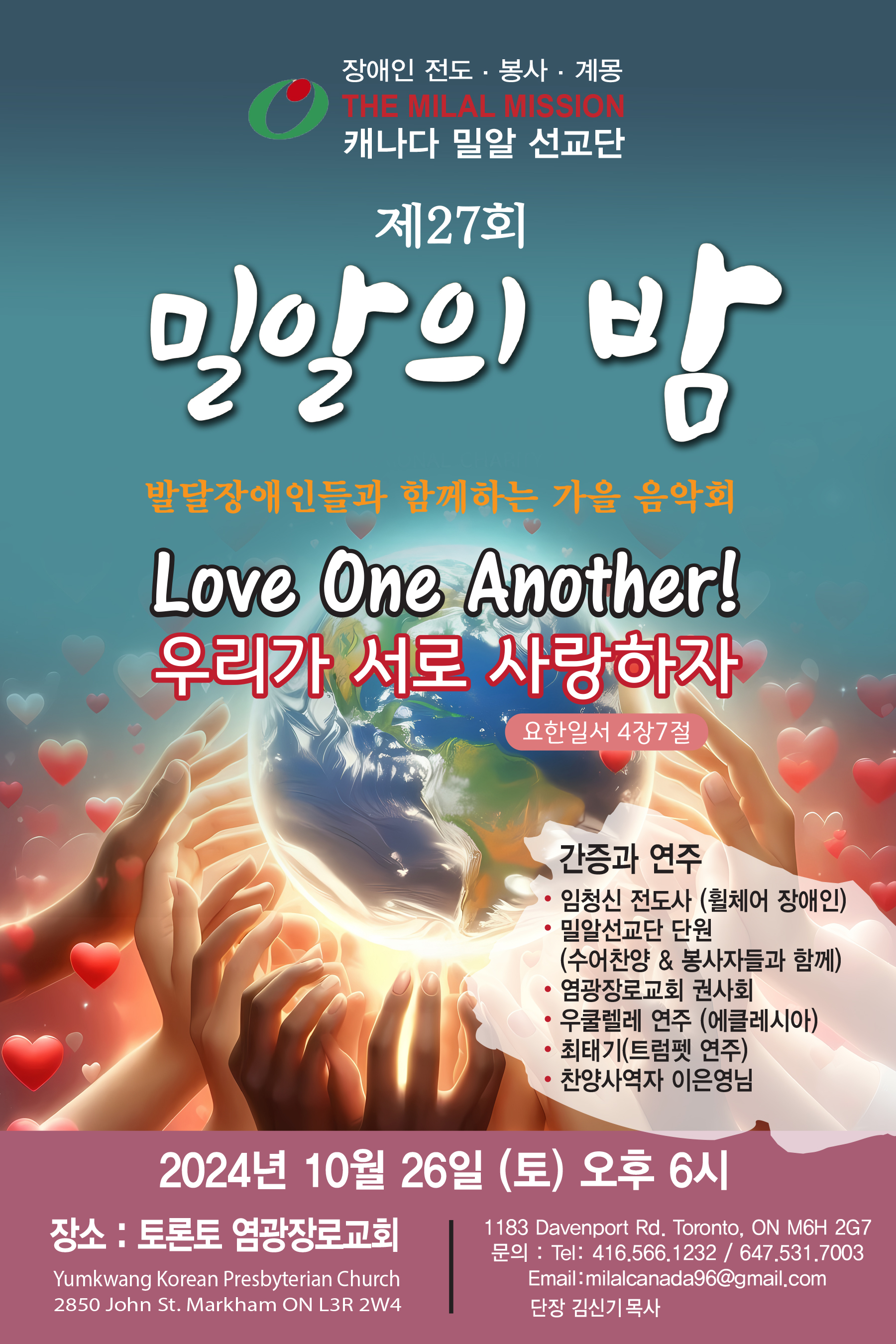 장애인 선교·봉사 및 계몽단체 캐나다 밀알선교단(단장 김신기 목사)이 장애우와 가족들에게 용기를 주고 후원자들과 함께 위로와 감사를 나누며 운영기금도 마련하기 위해 연례 개최하는 제27회 밀알의 밤이 ‘발달장애인과 함께 하는 가을음악회’로 10월26일(토) 오후 6시 소금과 빛 염광교회(담임 이요환 목사: 2850 John St., Markham, L3R 2W4)에서 열린다.